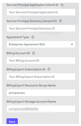NOTE: You may change the Resource Group Name and Billing Export Storage Account Name to follow your naming convention. These do not need to exist in your Azure Portal. They will be created later in the onboarding process.